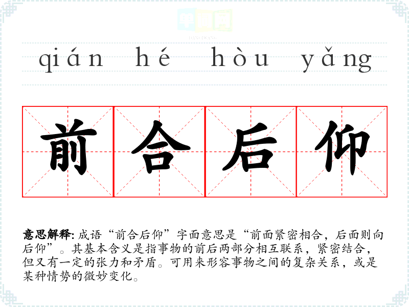 成语“前合后仰”字面意思是“前面紧密相合,后面则向后仰”。其基本含义是指事物的前后两部分相互联系,紧密结合,但又有一定的张力和矛盾。可用来形容事物之间的复杂关系,或是某种情势的微妙变化。