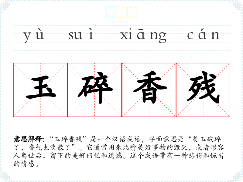 在**文化中,“玉”常被视为纯洁与美好的象征,而“香”则代表着美好事物的芬芳与温暖。“玉碎香残”反映了对美好事物消逝的悲伤,符合古代诗词中对美好与哀愁的双重追求。这一成语在现代社会依然适用,尤其是在追忆与怀念的情境中,能够引发人们的共鸣。