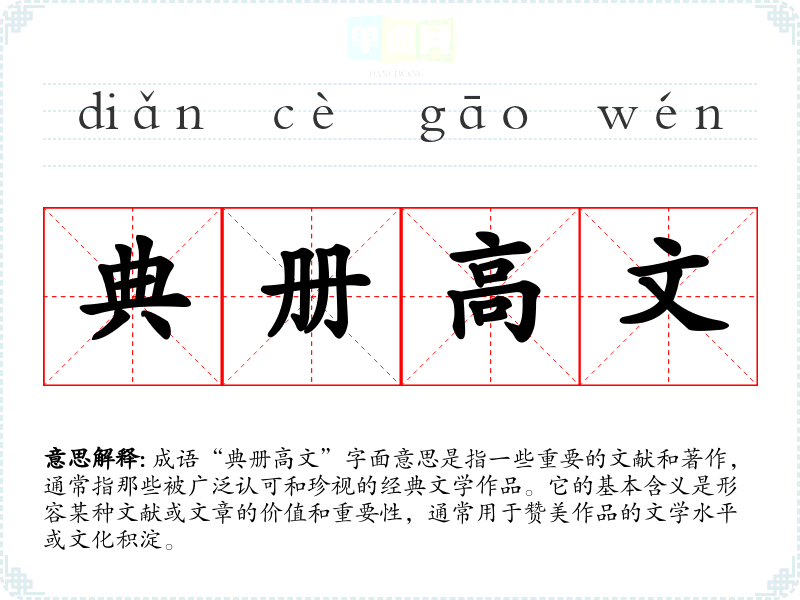 成语“典册高文”字面意思是指一些重要的文献和著作,通常指那些被广泛认可和珍视的经典文学作品。它的基本含义是形容某种文献或文章的价值和重要性,通常用于赞美作品的文学水平或文化积淀。