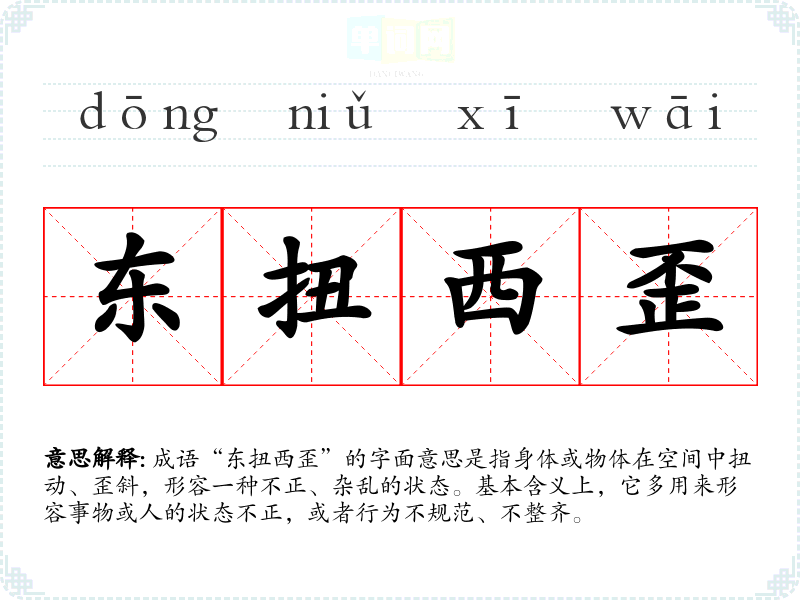 成语“东扭西歪”的字面意思是指身体或物体在空间中扭动、歪斜,形容一种不正、杂乱的状态。基本含义上,它多用来形容事物或人的状态不正,或者行为不规范、不整齐。