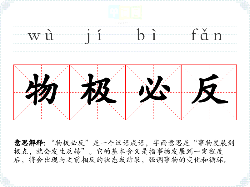 “物极必反”是一个汉语成语,字面意思是“事物发展到极点,就会发生反转”。它的基本含义是指事物发展到一定程度后,将会出现与之前相反的状态或结果,强调事物的变化和循环。