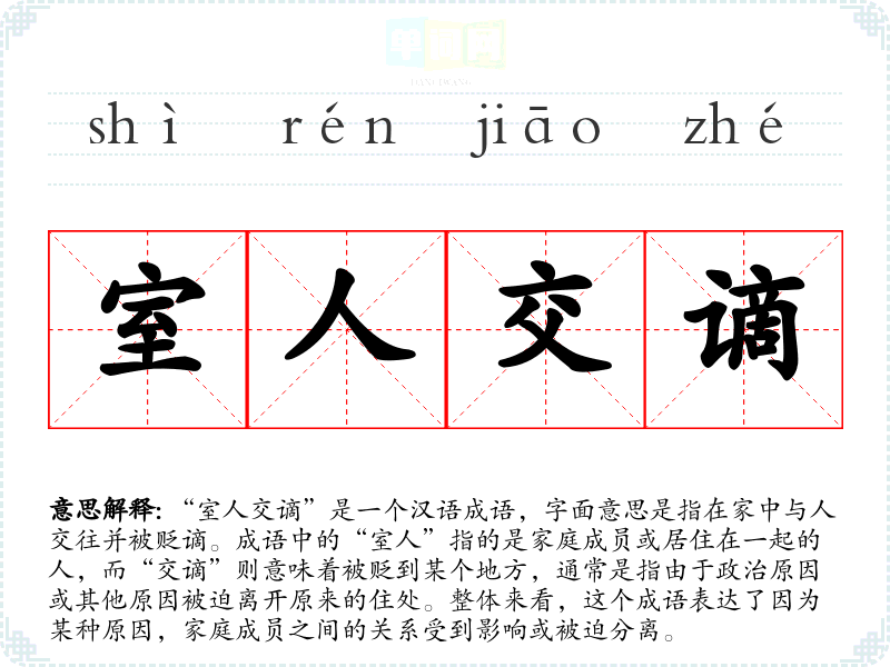 “室人交谪”是一个汉语成语,字面意思是指在家中与人交往并被贬谪。成语中的“室人”指的是家庭成员或居住在一起的人,而“交谪”则意味着被贬到某个地方,通常是指由于政治原因或其他原因被迫离开原来的住处。整体来看,这个成语表达了因为某种原因,家庭成员之间的关系受到影响或被迫分离。