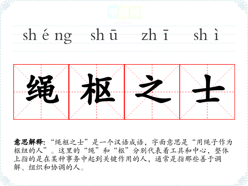 “绳枢之士”是一个汉语成语,字面意思是“用绳子作为枢纽的人”。这里的“绳”和“枢”分别代表着工具和中心,整体上指的是在某种事务中起到关键作用的人,通常是指那些善于调解、组织和协调的人。