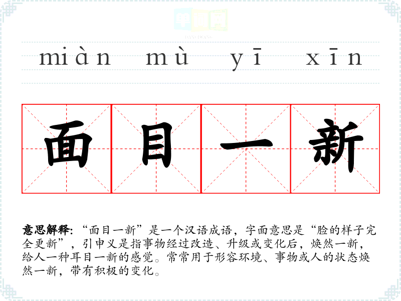 “面目一新”是一个汉语成语,字面意思是“脸的样子完全更新”,引申义是指事物经过改造、升级或变化后,焕然一新,给人一种耳目一新的感觉。常常用于形容环境、事物或人的状态焕然一新,带有积极的变化。