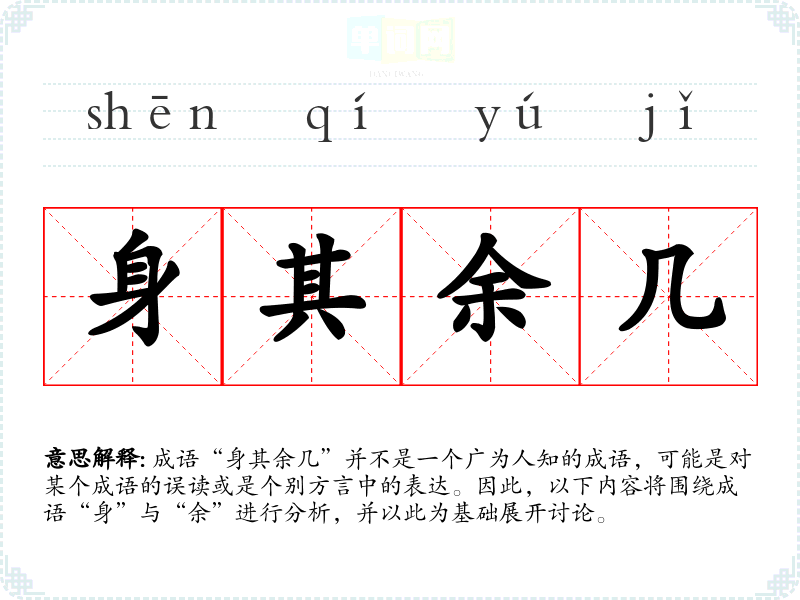 成语“身其余几”并不是一个广为人知的成语,可能是对某个成语的误读或是个别方言中的表达。因此,以下内容将围绕成语“身”与“余”进行分析,并以此为基础展开讨论。