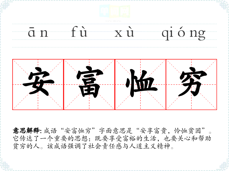 成语“安富恤穷”字面意思是“安享富贵,怜恤贫困”。它传达了一个重要的思想:既要享受富裕的生活,也要关心和帮助贫穷的人。该成语强调了社会责任感与人道主义精神。