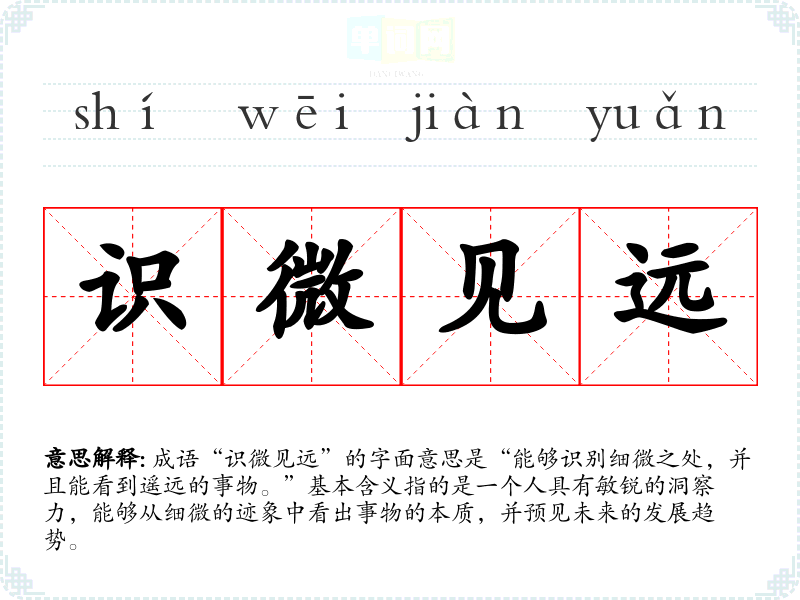 成语“识微见远”的字面意思是“能够识别细微之处,并且能看到遥远的事物。”基本含义指的是一个人具有敏锐的洞察力,能够从细微的迹象中看出事物的本质,并预见未来的发展趋势。