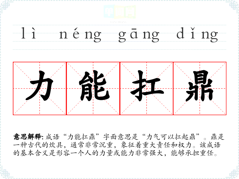 成语“力能扛鼎”字面意思是“力气可以扛起鼎”。鼎是一种古代的炊具,通常非常沉重,象征着重大责任和权力。该成语的基本含义是形容一个人的力量或能力非常强大,能够承担重任。