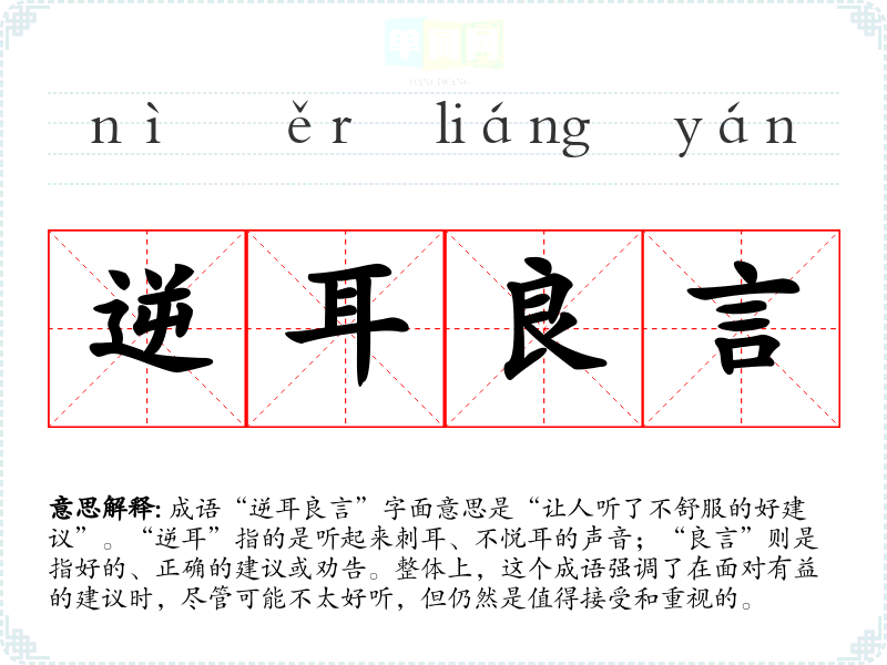 成语“逆耳良言”字面意思是“让人听了不舒服的好建议”。“逆耳”指的是听起来刺耳、不悦耳的声音;“良言”则是指好的、正确的建议或劝告。整体上,这个成语强调了在面对有益的建议时,尽管可能不太好听,但仍然是值得接受和重视的。