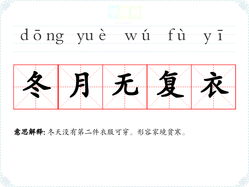 | 冬月无复衣 | 冬天没有第二件衣服可穿。形容家境贫寒。 |