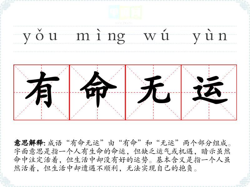 成语“有命无运”由“有命”和“无运”两个部分组成。字面意思是指一个人有生命的命运,但缺乏运气或机遇,暗示虽然命中注定活着,但生活中却没有好的运势。基本含义是指一个人虽然活着,但生活中却遭遇不顺利,无法实现自己的抱负。