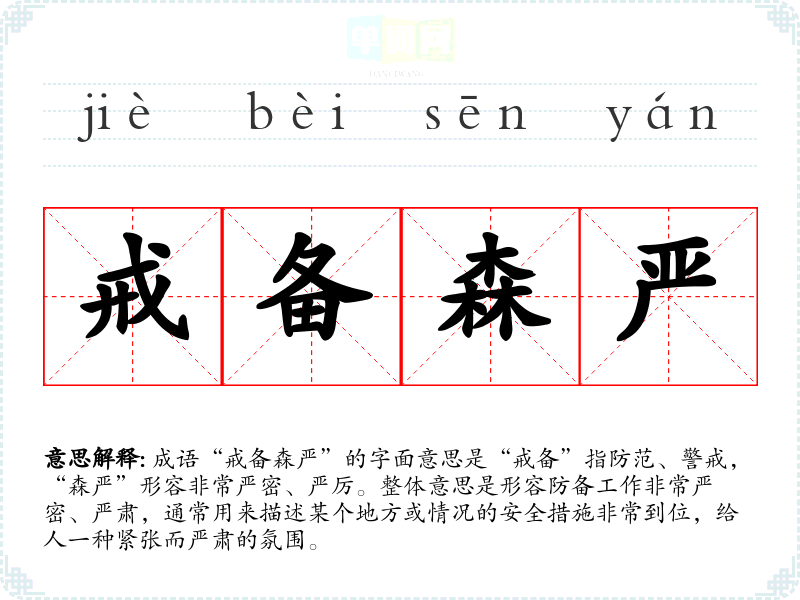 成语“戒备森严”的字面意思是“戒备”指防范、警戒,“森严”形容非常严密、严厉。整体意思是形容防备工作非常严密、严肃,通常用来描述某个地方或情况的安全措施非常到位,给人一种紧张而严肃的氛围。