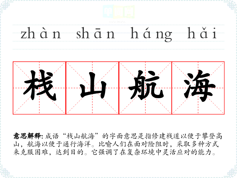 成语“栈山航海”的字面意思是指修建栈道以便于攀登高山,航海以便于通行海洋。比喻人们在面对险阻时,采取多种方式来克服困难,达到目的。它强调了在复杂环境中灵活应对的能力。