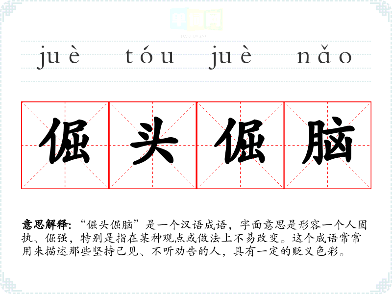 “倔头倔脑”是一个汉语成语,字面意思是形容一个人固执、倔强,特别是指在某种观点或做法上不易改变。这个成语常常用来描述那些坚持己见、不听劝告的人,具有一定的贬义色彩。