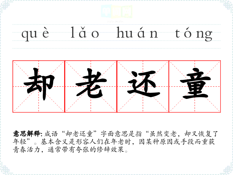成语“却老还童”字面意思是指“虽然变老,却又恢复了年轻”。基本含义是形容人们在年老时,因某种原因或手段而重获青春活力,通常带有夸张的修辞效果。