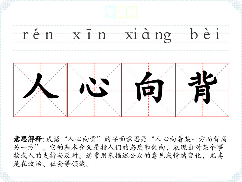 成语“人心向背”的字面意思是“人心向着某一方而背离另一方”。它的基本含义是指人们的态度和倾向,表现出对某个事物或人的支持与反对。通常用来描述公众的意见或情绪变化,尤其是在政治、社会等领域。
