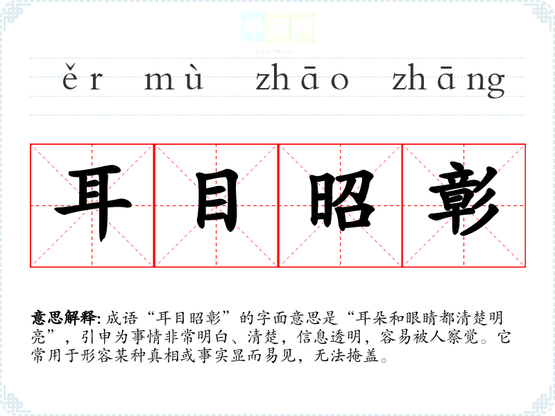 成语“耳目昭彰”的字面意思是“耳朵和眼睛都清楚明亮”,引申为事情非常明白、清楚,信息透明,容易被人察觉。它常用于形容某种真相或事实显而易见,无法掩盖。
