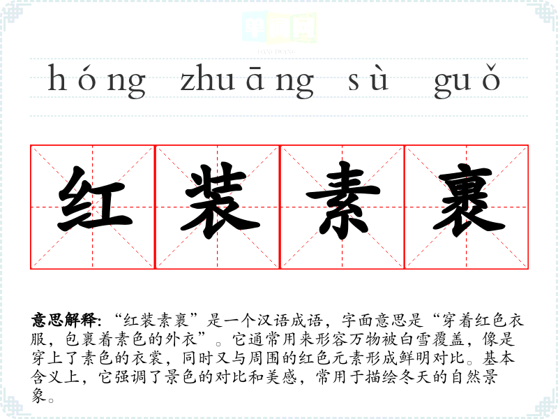 在文化中,红色常常象征着吉祥和喜庆,而白色则往往与纯洁和宁静相关。“红装素裹”不仅描绘了自然之美,也反映了人对自然的热爱和对季节变化的细腻观察。在现代社会,这个成语可以用来表达对美好生活的向往。