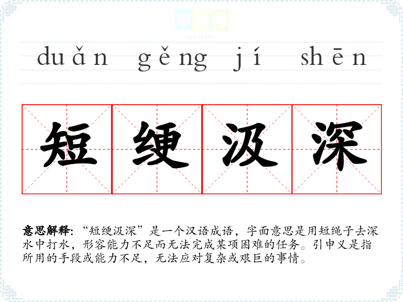 “短绠汲深”是一个汉语成语,字面意思是用短绳子去深水中打水,形容能力不足而无法完成某项困难的任务。引申义是指所用的手段或能力不足,无法应对复杂或艰巨的事情。