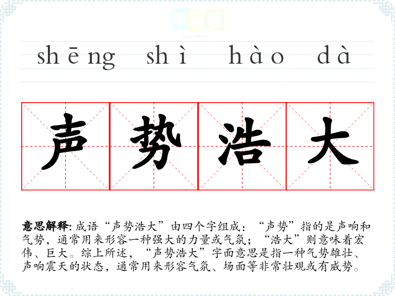 成语“声势浩大”由四个字组成:“声势”指的是声响和气势,通常用来形容一种强大的力量或气氛;“浩大”则意味着宏伟、巨大。综上所述,“声势浩大”字面意思是指一种气势雄壮、声响震天的状态,通常用来形容气氛、场面等非常壮观或有威势。