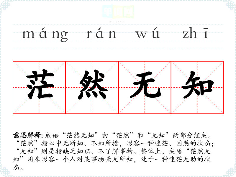 成语“茫然无知”由“茫然”和“无知”两部分组成。“茫然”指心中无所知、不知所措,形容一种迷茫、困惑的状态;“无知”则是指缺乏知识、不了解事物。整体上,成语“茫然无知”用来形容一个人对某事物毫无所知,处于一种迷茫无助的状态。