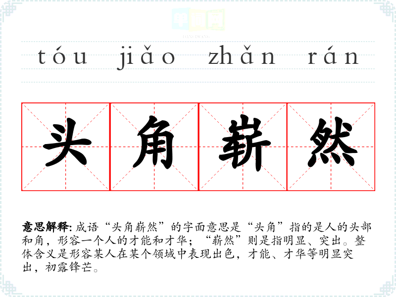 成语“头角崭然”的字面意思是“头角”指的是人的头部和角,形容一个人的才能和才华;“崭然”则是指明显、突出。整体含义是形容某人在某个领域中表现出色,才能、才华等明显突出,初露锋芒。