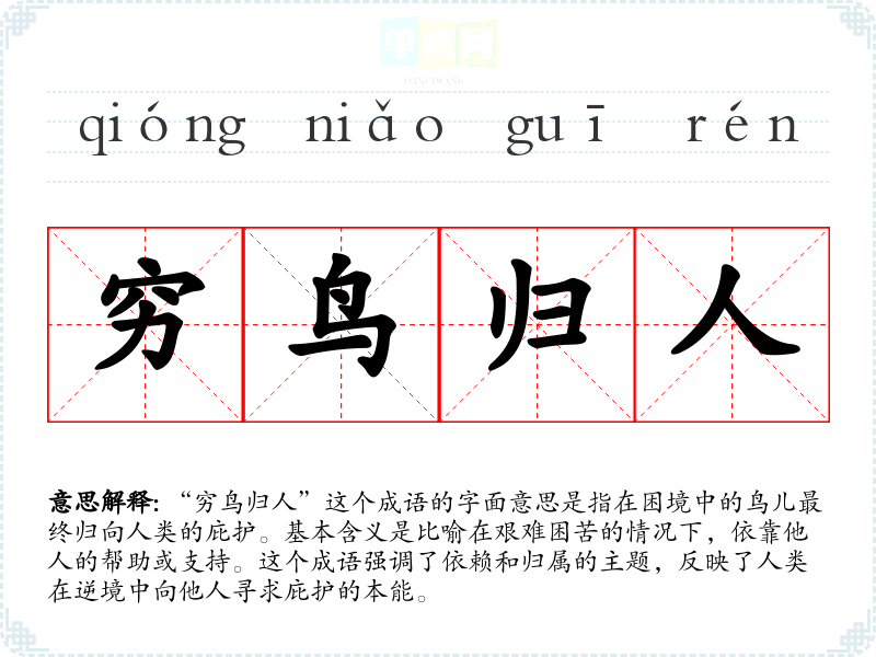 “穷鸟归人”这个成语的字面意思是指在困境中的鸟儿最终归向人类的庇护。基本含义是比喻在艰难困苦的情况下,依靠他人的帮助或支持。这个成语强调了依赖和归属的主题,反映了人类在逆境中向他人寻求庇护的本能。