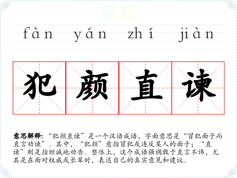 “犯颜直谏”是一个汉语成语,字面意思是“冒犯面子而直言劝谏”。其中,“犯颜”意指冒犯或违反某人的面子;“直谏”则是指坦诚地劝告。整体上,这个成语强调敢于直言不讳,尤其是在面对权威或长辈时,表达自己的真实意见和建议。