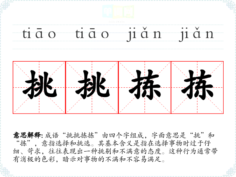 成语“挑挑拣拣”由四个字组成,字面意思是“挑”和“拣”,意指选择和挑选。其基本含义是指在选择事物时过于仔细、苛求,往往表现出一种挑剔和不满意的态度。这种行为通常带有消极的色彩,暗示对事物的不满和不容易满足。
