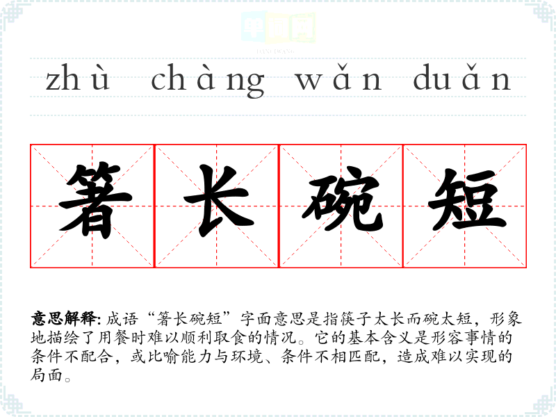 成语“箸长碗短”字面意思是指筷子太长而碗太短,形象地描绘了用餐时难以顺利取食的情况。它的基本含义是形容事情的条件不配合,或比喻能力与环境、条件不相匹配,造成难以实现的局面。