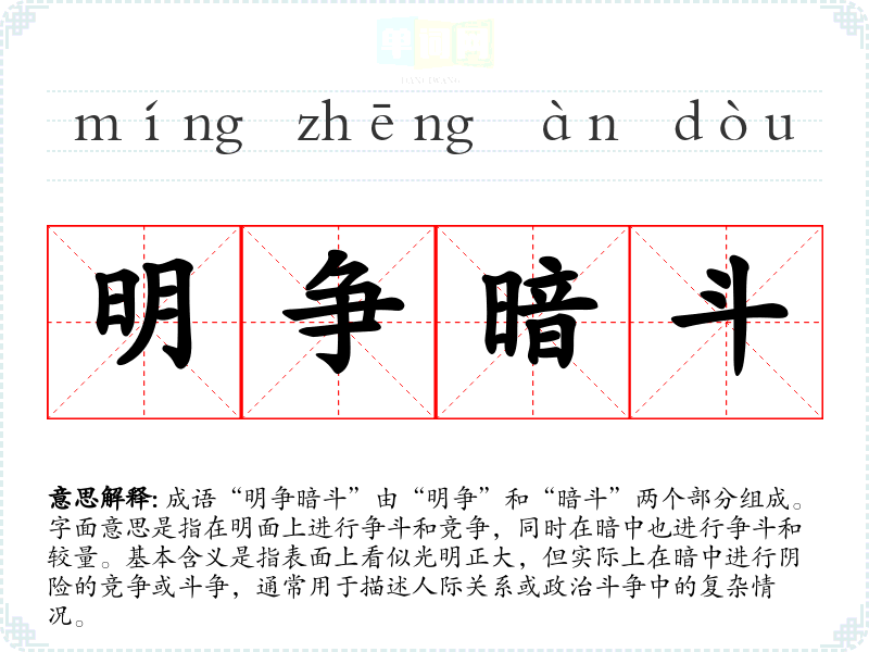 成语“明争暗斗”由“明争”和“暗斗”两个部分组成。字面意思是指在明面上进行争斗和竞争,同时在暗中也进行争斗和较量。基本含义是指表面上看似光明正大,但实际上在暗中进行阴险的竞争或斗争,通常用于描述人际关系或政治斗争中的复杂情况。