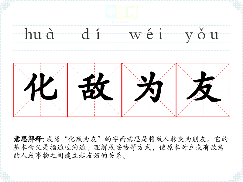 成语“化敌为友”的字面意思是将敌人转变为朋友。它的基本含义是指通过沟通、理解或妥协等方式,使原本对立或有敌意的人或事物之间建立起友好的关系。