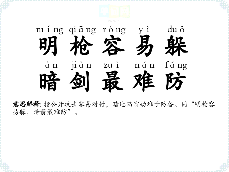 | 明枪容易躲,暗剑最难防 | 指公开攻击容易对付,暗地陷害劫难于防备。同“明枪容易躲,暗箭最难防”。 |