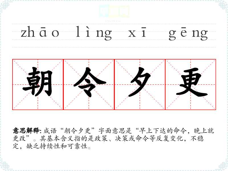 朝令夕更 朝:早上;夕:黄昏。早晨下命令,晚上就改变。形容政令多变,让人无所适从。