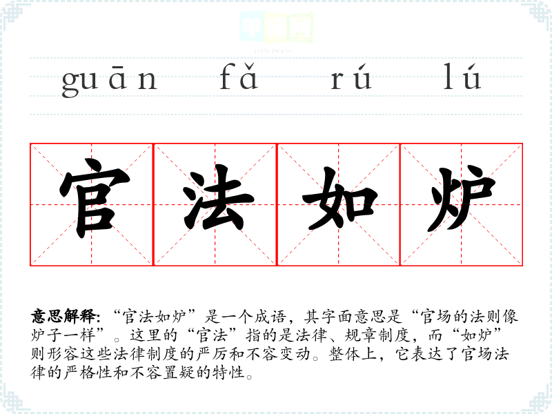 “官法如炉”是一个成语,其字面意思是“官场的法则像炉子一样”。这里的“官法”指的是法律、规章制度,而“如炉”则形容这些法律制度的严厉和不容变动。整体上,它表达了官场法律的严格性和不容置疑的特性。