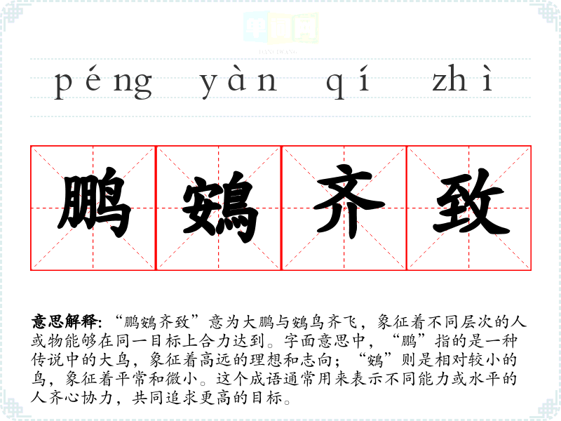 “鹏鴳齐致”意为大鹏与鴳鸟齐飞,象征着不同层次的人或物能够在同一目标上合力达到。字面意思中,“鹏”指的是一种传说中的大鸟,象征着高远的理想和志向;“鴳”则是相对较小的鸟,象征着平常和微小。这个成语通常用来表示不同能力或水平的人齐心协力,共同追求更高的目标。