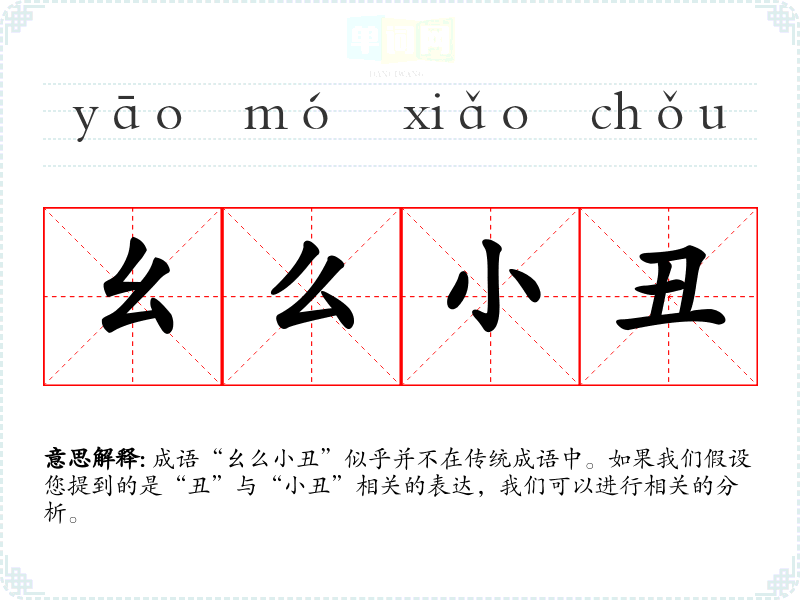 成语“幺么小丑”似乎并不在传统成语中。如果我们假设您提到的是“丑”与“小丑”相关的表达,我们可以进行相关的分析。