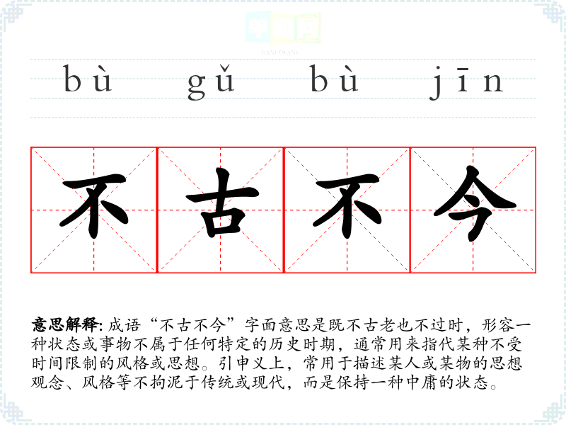 成语“不古不今”字面意思是既不古老也不过时,形容一种状态或事物不属于任何特定的历史时期,通常用来指代某种不受时间限制的风格或思想。引申义上,常用于描述某人或某物的思想观念、风格等不拘泥于传统或现代,而是保持一种中庸的状态。