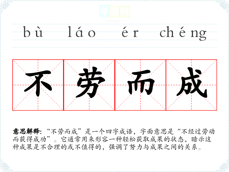 “不劳而成”是一个四字成语,字面意思是“不经过劳动而获得成功”。它通常用来形容一种轻松获取成果的状态,暗示这种成果是不合理的或不值得的,强调了努力与成果之间的关系。