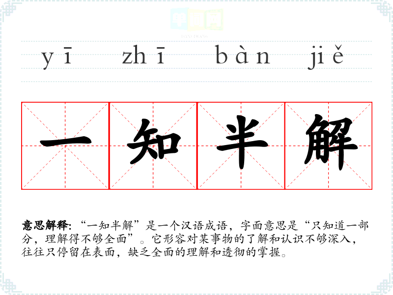 “一知半解”是一个汉语成语,字面意思是“只知道一部分,理解得不够全面”。它形容对某事物的了解和认识不够深入,往往只停留在表面,缺乏全面的理解和透彻的掌握。