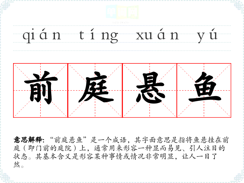 “前庭悬鱼”是一个成语,其字面意思是指将鱼悬挂在前庭(即门前的庭院)上,通常用来形容一种显而易见、引人注目的状态。其基本含义是形容某种事情或情况非常明显,让人一目了然。