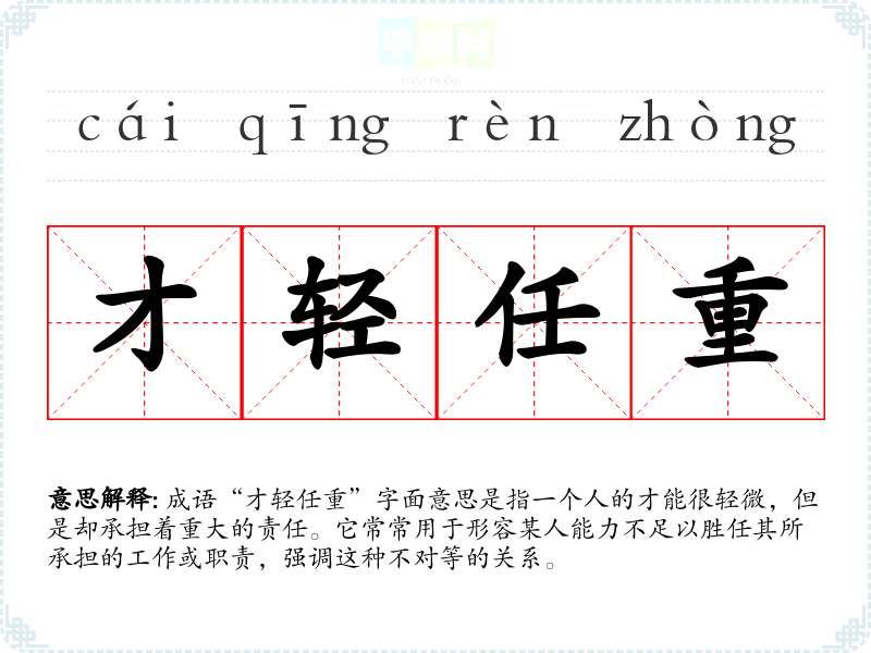 成语“才轻任重”字面意思是指一个人的才能很轻微,但是却承担着重大的责任。它常常用于形容某人能力不足以胜任其所承担的工作或职责,强调这种不对等的关系。