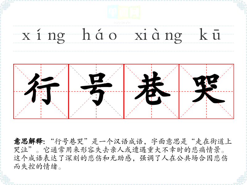 “行号巷哭”并没有明确的历史典故或文献出处,它更多地反映了人们在面对悲痛时的自然反应。这个成语的构成是由“行”(走)、“号”(哭泣)、“巷”(街道)和“哭”四个字组成,体现了悲伤的情绪在公共空间的泛滥。