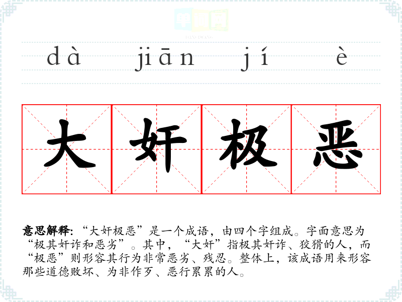 “大奸极恶”是一个成语,由四个字组成。字面意思为“极其奸诈和恶劣”。其中,“大奸”指极其奸诈、狡猾的人,而“极恶”则形容其行为非常恶劣、残忍。整体上,该成语用来形容那些道德败坏、为非作歹、恶行累累的人。