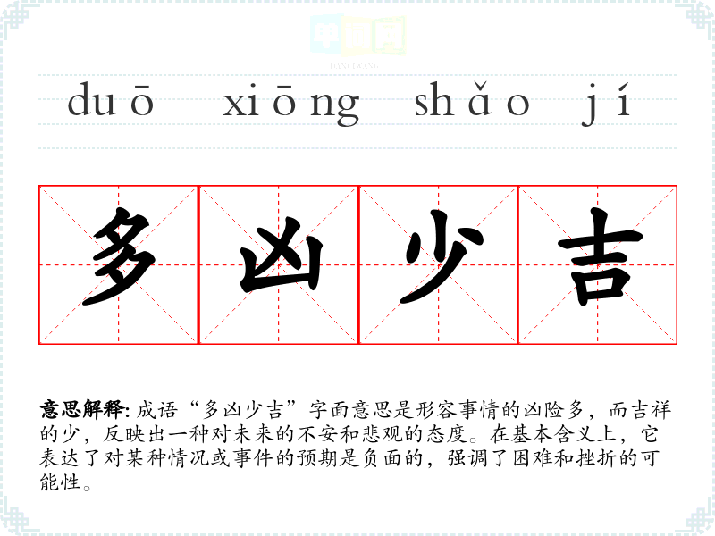 “多凶少吉”并没有明确的历史典故或文献出处,但其构成的字词在古代文学中常常被用来表达对命运和未来的不确定感。可以推测,这一成语是在对命运和人生的观察中逐渐演变而成,反映了人们对生活中不幸和困难的普遍感受。