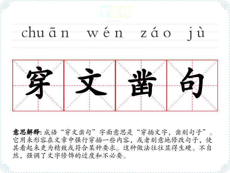 成语“穿文凿句”字面意思是“穿插文字,凿刻句子”。它用来形容在文章中强行穿插一些内容,或者刻意地修改句子,使其看起来更为精致或符合某种要求。这种做法往往显得生硬、不自然,强调了文字修饰的过度和不必要。