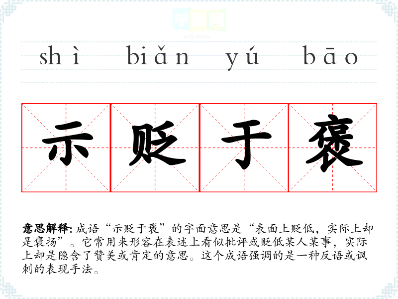 成语“示贬于褒”的字面意思是“表面上贬低,实际上却是褒扬”。它常用来形容在表述上看似批评或贬低某人某事,实际上却是隐含了赞美或肯定的意思。这个成语强调的是一种反语或讽刺的表现手法。
