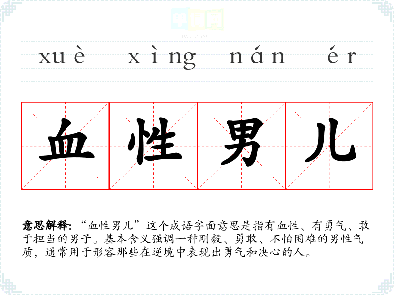| 血性男儿 | 指刚强正直,勇敢热情的男子汉。 |