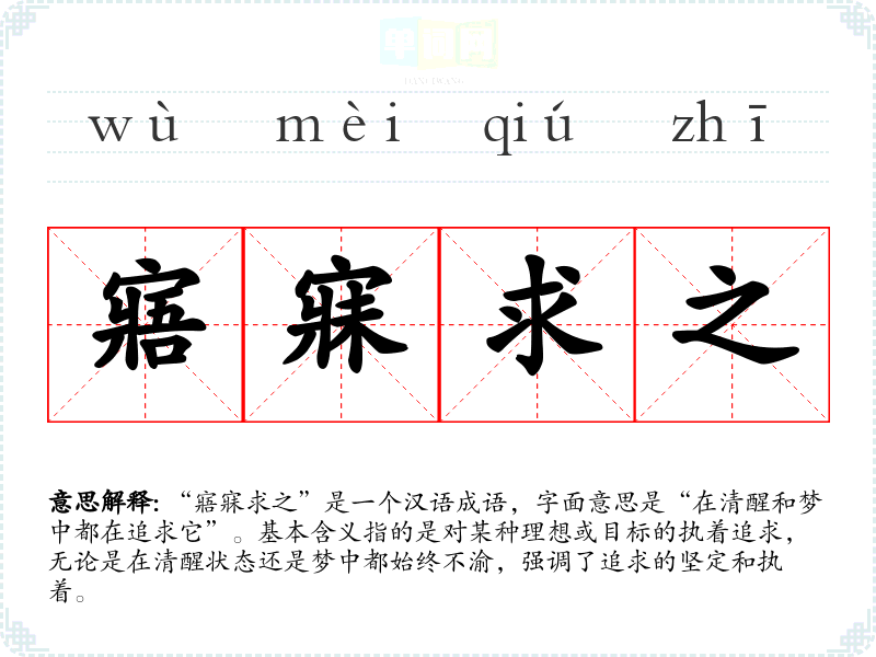 “寤寐求之”是一个汉语成语,字面意思是“在清醒和梦中都在追求它”。基本含义指的是对某种理想或目标的执着追求,无论是在清醒状态还是梦中都始终不渝,强调了追求的坚定和执着。