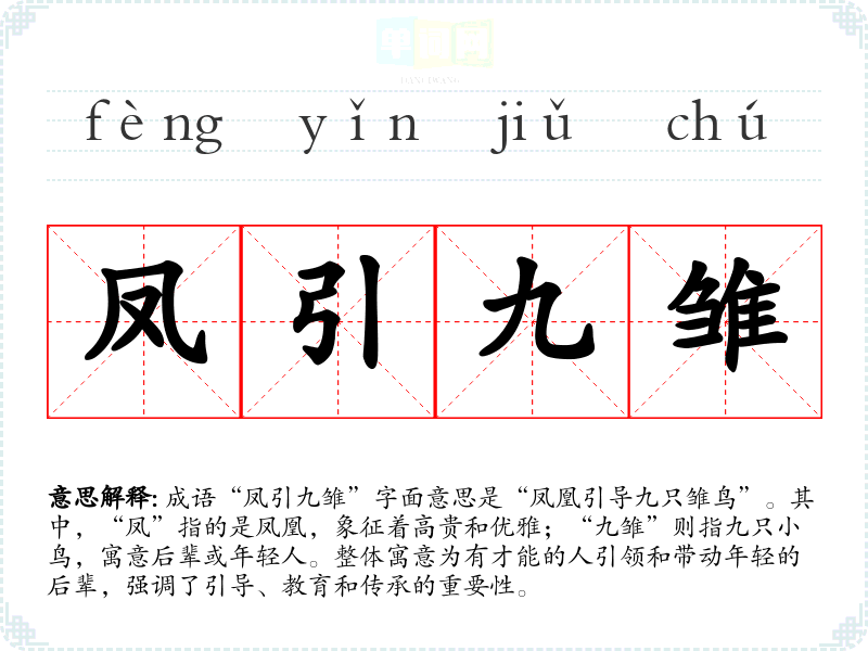 通过对“凤引九雏”的学*,我深刻体会到教育和引导的力量。这不仅丰富了我的语言表达,也让我在生活中更加关注如何成为一个好的引导者,去影响和帮助他人。